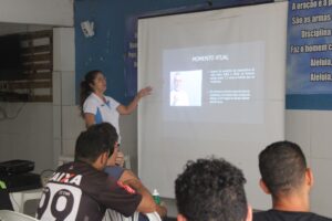 A programação teve início com a palestra da Dra. Wallana, que falou sobre as principais doenças que afetam os homens, como o câncer de próstata e testículo e doenças cardiovasculares, e a saúde do homem de forma geral, além de responder dúvidas dos acolhidos. O principal intuito da conversa foi desmistificar algumas crenças e acabar com o preconceito de homens em buscar ajuda. Ainda, foi aproveitada a oportunidade para fazer uma relação entre saúde e dependência química.